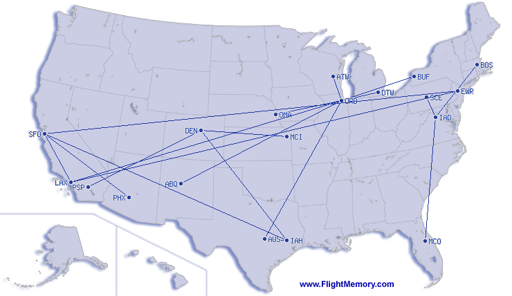 | Найкоротший політ: | 299 mi, 1:02 h, Des Moines (International) - Chicago (O'Hare), 04-23-2026 |