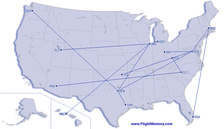| Længste flyetid: | 9:21 h, 4,241 mi, Chicago (O'Hare) - Honolulu (Daniel K. Inouye Int.), 02-03-2026 |
